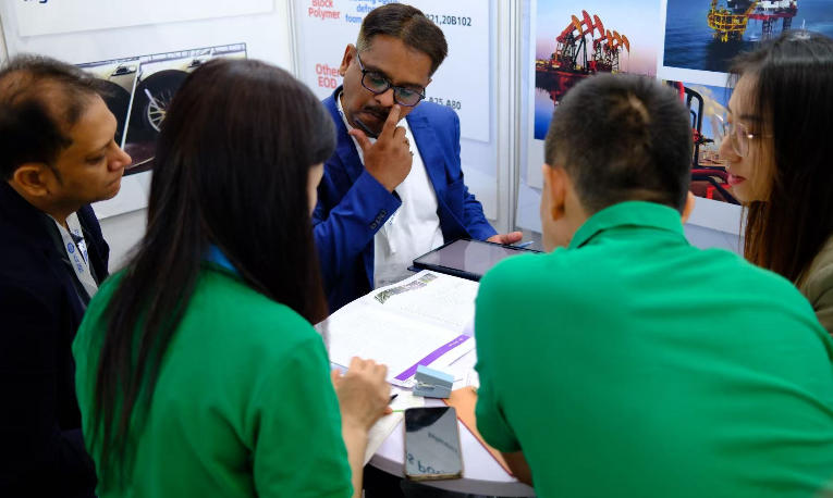 The most eye-catching displays at the booth were our “flagship product matrix” built on three key technologies—hydrogenation, amination, and ethoxylation. Cationic bactericides act as a “protective shield” for agricultural crops, improving the wetting and adhesion of pesticide solutions; oilfield demulsifiers help optimize oil-water separation and boost crude recovery efficiency; while asphalt emulsifiers make road construction more efficient and stable. Every product addresses specific industry pain points, backed by our team’s hands-on experience from giants like Solutia and Nouryon, as well as a steadfast commitment to “efficient conversion of bio-based raw materials” for sustainable development. As the banner behind our booth read: “Empowering sustainability through chemical innovation”.